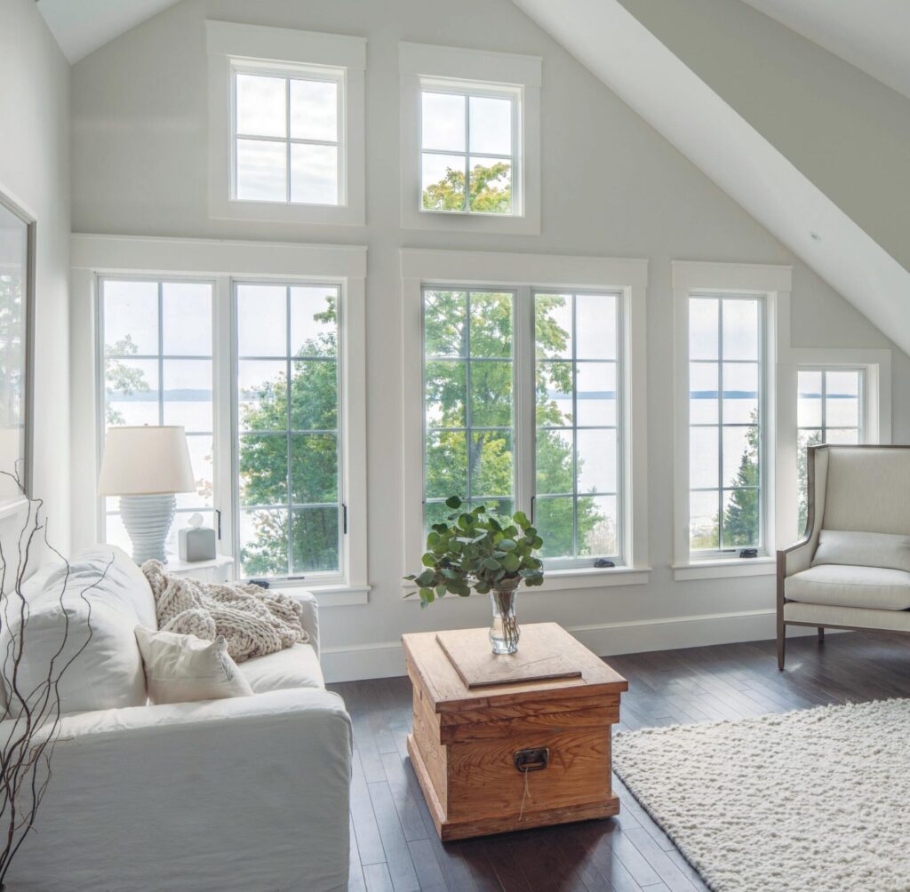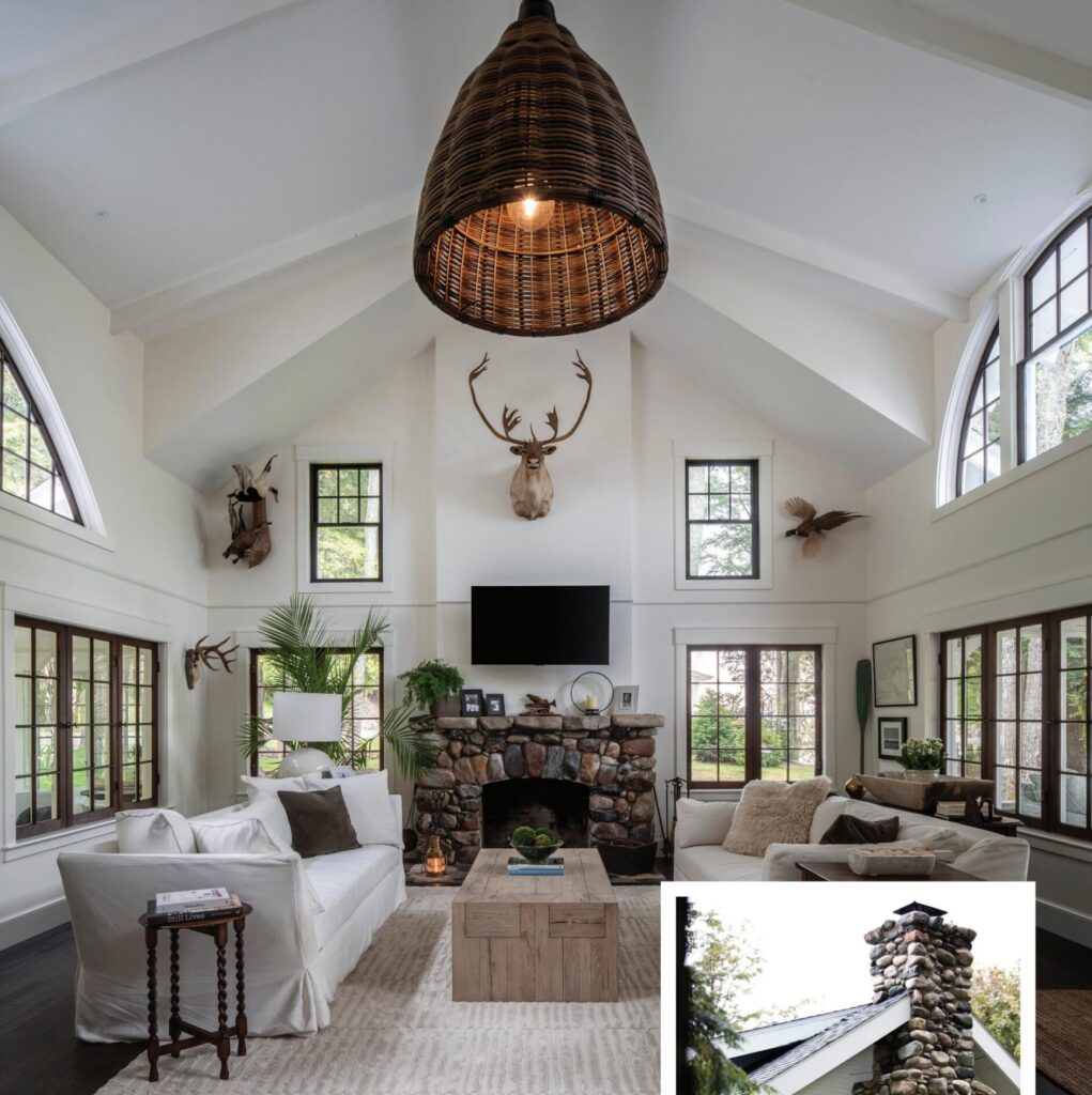 The renovated double-height great room and stone fireplace, part of the original cottage, features arched windows that capture the natural light and stunning views.
