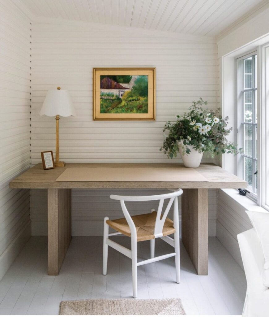 A simple at-home office, is accented by custom-routered siding that was manufactured to emulate the original siding exterior…